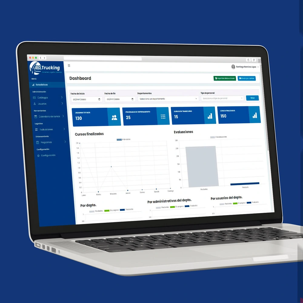 BG Trucking es un sistema web desarrollado para gestionar entrenamientos y capacitaciones dentro de la empresa, con módulos que permiten la administración de usuarios, departamentos, programas de entrenamiento, evaluaciones, y más. Este sistema permite a la empresa controlar el progreso de sus empleados y mejorar la eficiencia operativa.